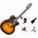 Elektro-akustická gitara zo série G70, 12-strunové jumbo s prednou doskou vyrobenou z masívneho smrekového dreva, zadná doska a boky sú zo žíhaného javora, gitara má špeciálne „X“ vystuženie, mahagónový krk s palisandrovým/ovankgolovým hmatníkom je osadený 20 pražcami, 644mm menzúra a 12“ rádius hmatníka, elektronika TK-40D so vstavanou ladičkou a 3-pásmovým ekvalizérom, palisandrová kobylka, zlatý hardware s Die-Cast ladiacimi mechanikami, prevedenie Brown Sunburst.S mohutným jumbo telom, masívnou konštrukciou, nevšednými kozmetickými prvkami a prémiovou elektronikou je GJ72CE vyrobená pre vystúpenia. GJ72CE ponúka vrchnú dosku z masívneho smreku, boky, zadnú stranu zo žíhaného javorového dreva a tvar tela, ktorý je spojený s robustným zvukom a hlasitosťou. Tenký mahagónový krk s 12" rádiusom palisandrového hmatníka, poskytujúci skvelý pocit a hrateľnosť. Predzosilňovač Takamine TK-40D so vstavanou ladičkou, 3-pásmovým ekvalizérom, Mid Contour prepínačom, Notch filtrom a EQ bypass prepínačom pre maximálnu všestrannosť a kvalitu zvuku. Ďalšími skvelými prvkami sú palisandrová kobylka s kameňom rozdeleným na dve časti, čo má na svedomí ešte sladšie znejúce akordy, zlaté ladiace mechaniky s perleťovými hlavičkami a krásne lakovanie.